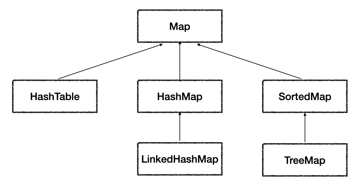 Map의 경우 List와 Set과는 다른 형태로 컬렉션을 다루기 때문에 같은 상속 계층도에 포함되지 못했습니다.
