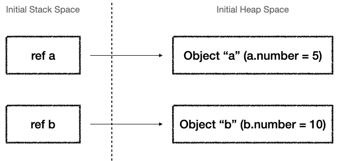 1. main()가 실행될 때, a, b 에는 Object를 참조하는 참조변수가 Stack Memory에 저장됩니다.