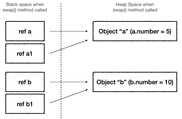 2. swap() 메서드를 호출했을 때, Stack memory의 다른 위치에 똑같은 값이 복사되어 저장됩니다.