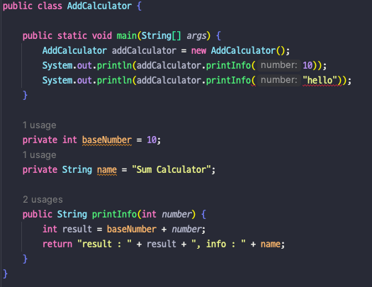 AddCalculator라는 클래스가 있으며 baseNumber, name 변수 모두 데이터 타입을 지정해 주었습니다.