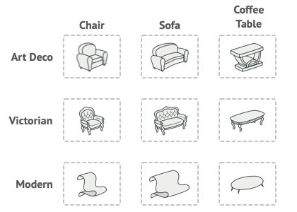 가구점에서는 크게 Art Deco, Victorian, Modern 테마로 가구를 만들고 있으며, 가구점에서는 의자, 소파, 커피테이블을 만듭니다.