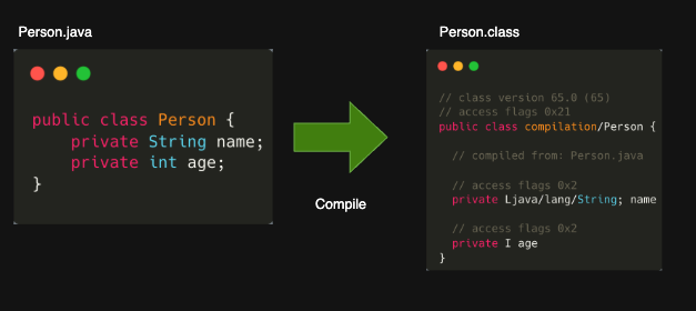 예를 들어 Person.java 파일이 있다면, 컴파일을 거쳐 Person.class라는 바이트코드 파일이 생성되고, 이는 JVM 위에서 실행된다.